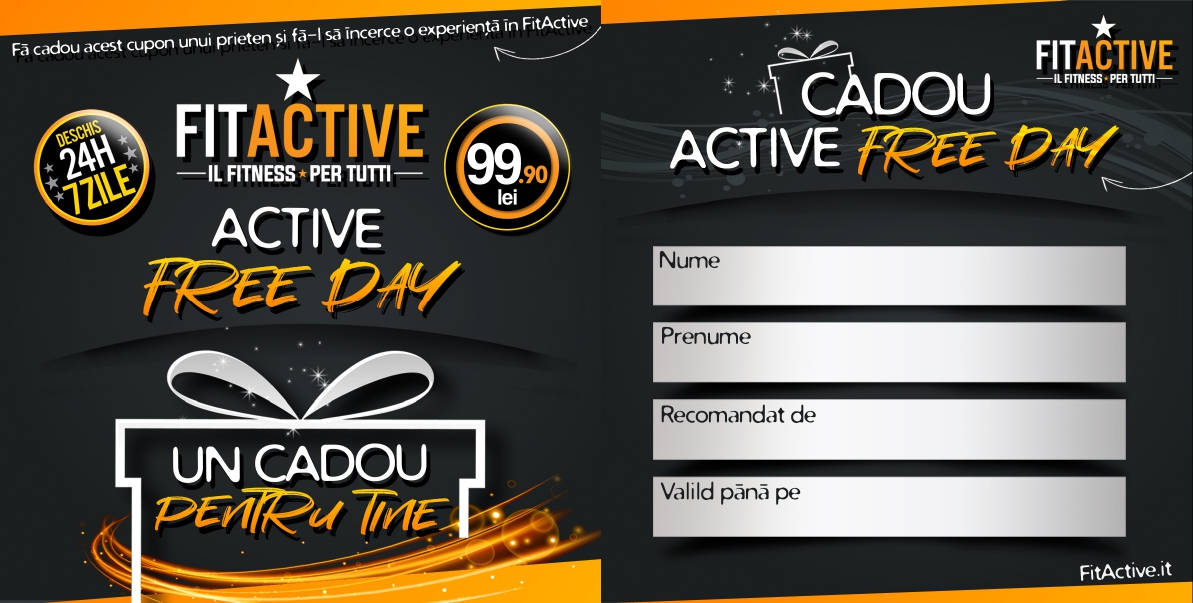 Completați cuponul și primiți imediat o "Active Free Day" pentru a oferi uni prieten o zi complet gratuită în unul din cluburile preferate FitActive!!